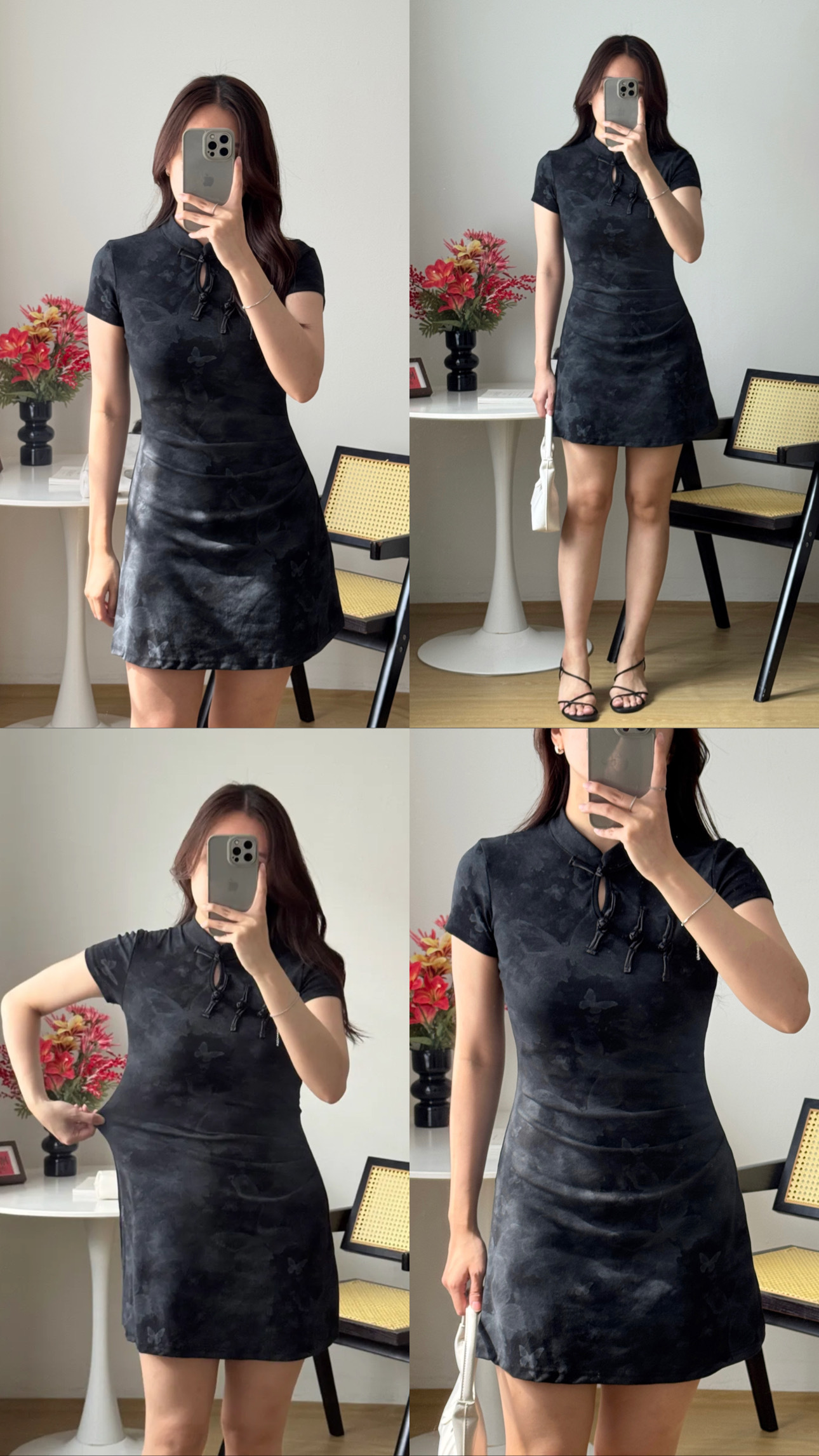 - Shortsleeve cheongsam with mandarin collor and adjustable button closure