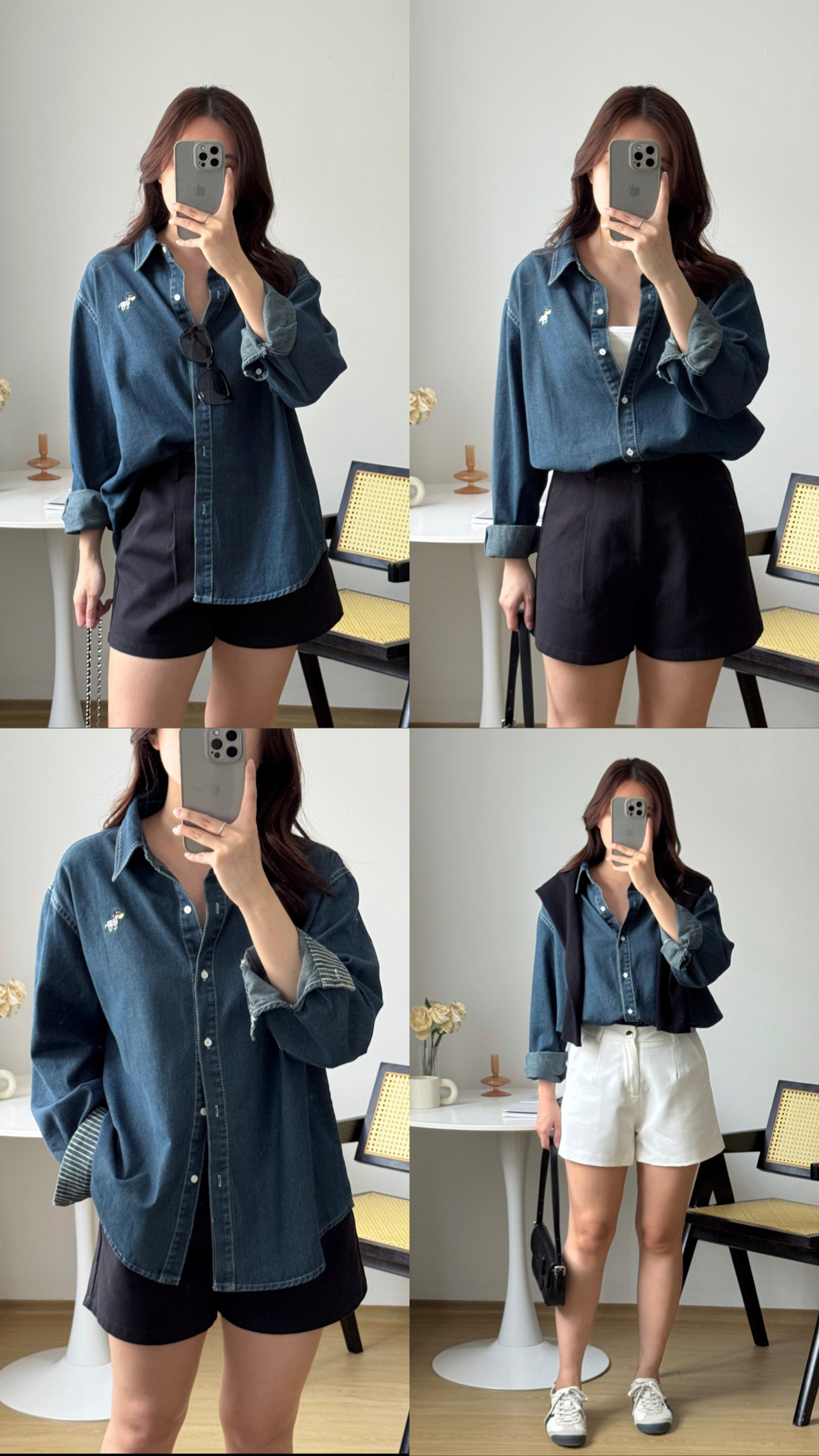 - Oversized button-up blouse with dropped shoulders and a rounded hem