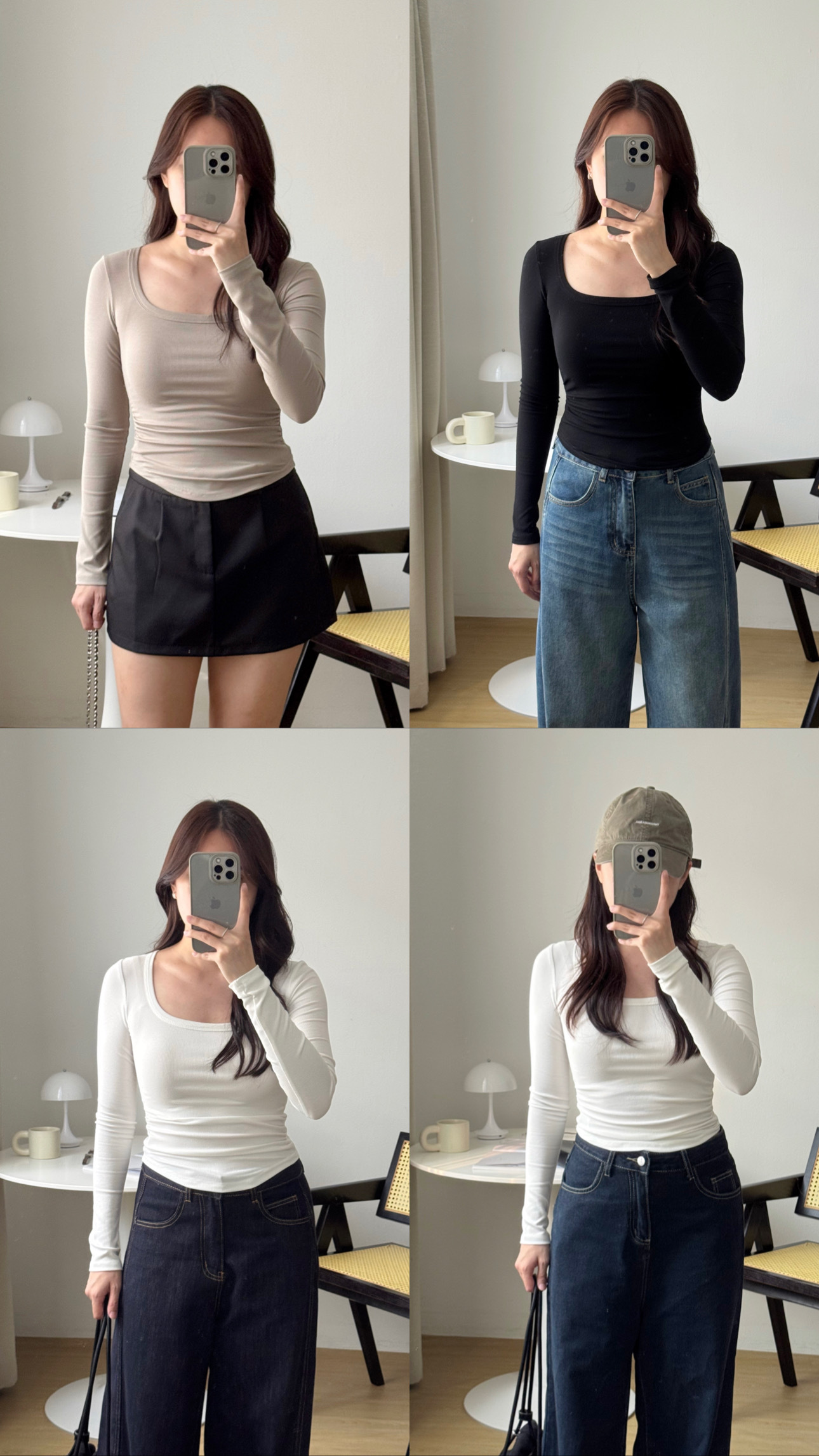 Ruched U-Neck Fitted Top (Black/White/Khaki)