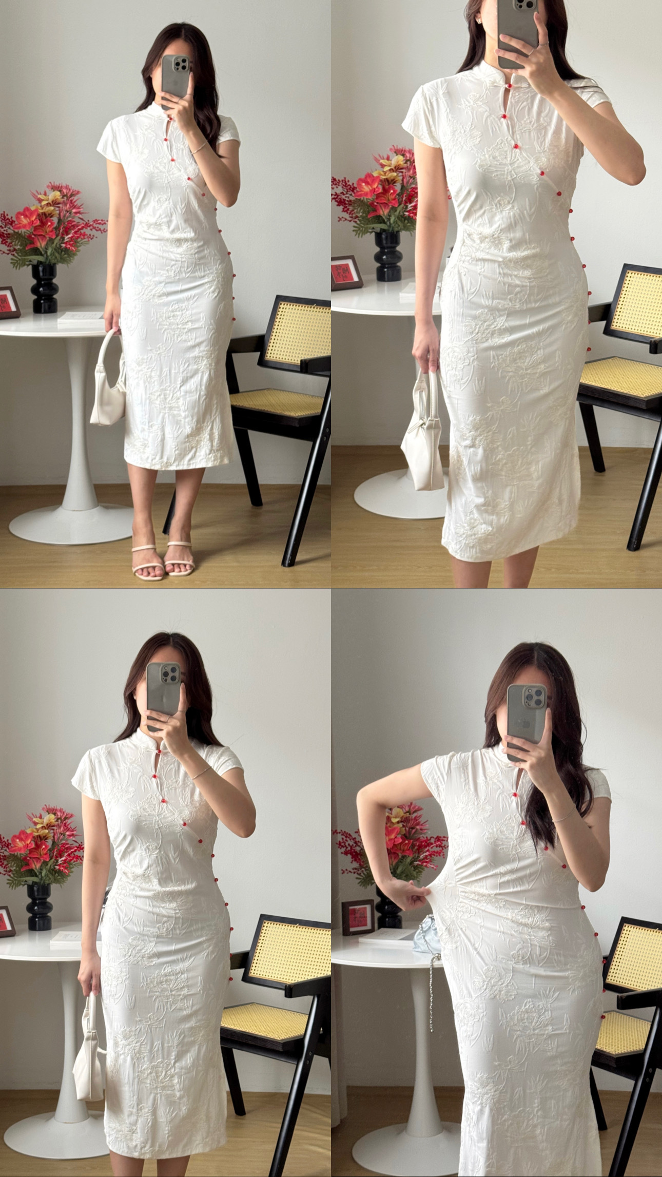 • Shortsleeve cheongsam dress with side slit, invisible back zip & adjustable button closure