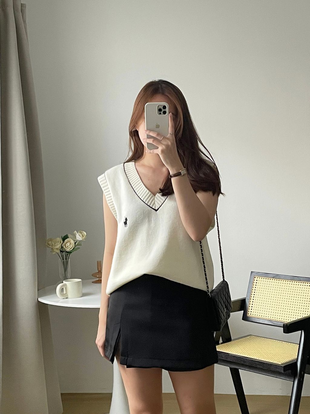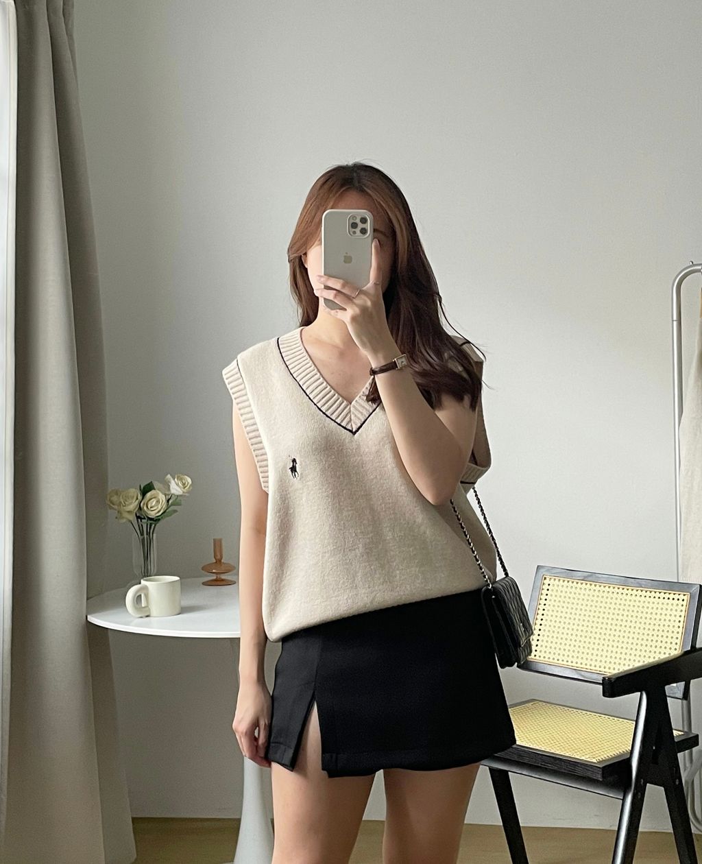 - V-neck, knit sweater vest with relaxed fit cutting & contrast stripe detail