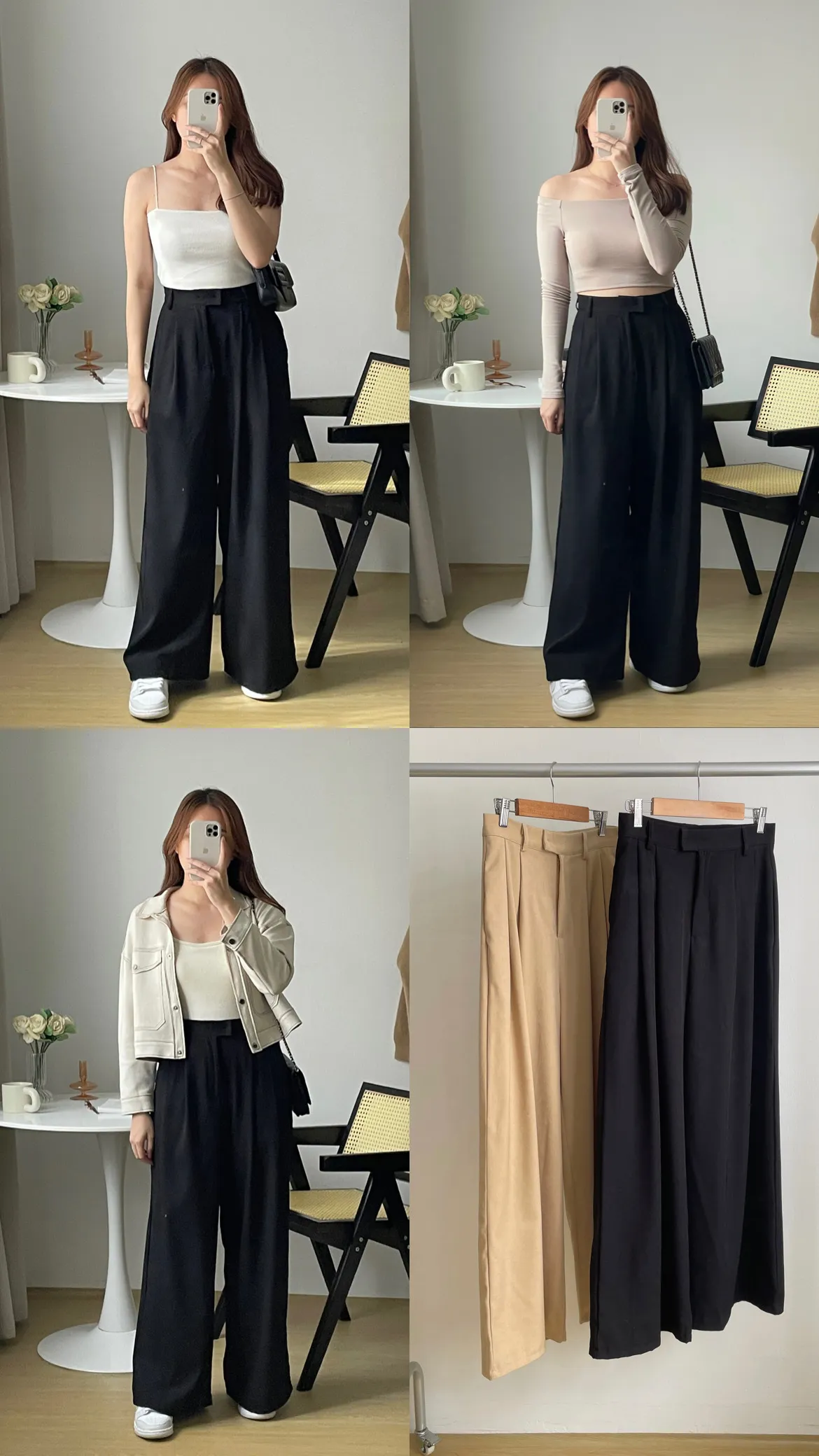 - Relaxed high-rise pants with front knife pleats, easy drape, and a long wide leg